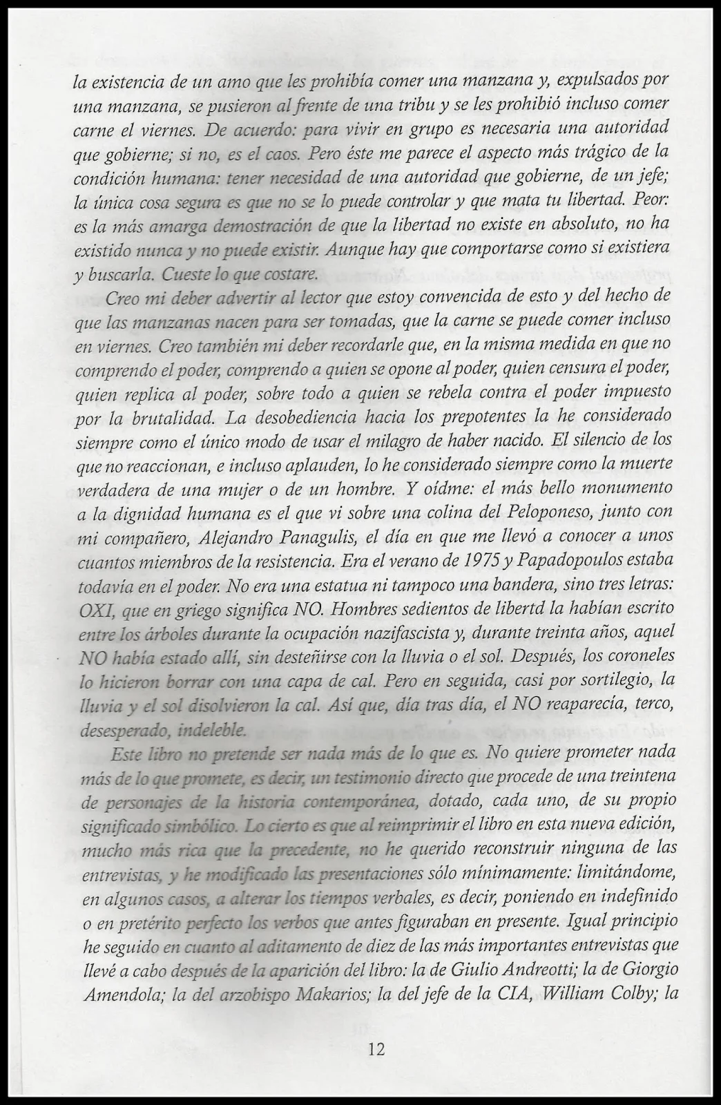 El libro concluye con una entrevista al político y poeta griego Alejandro Panagulis, fundador y jefe de la resistencia griega, el movimiento que los coroneles nunca pudieron destruir. Luego, fue compañero de vida de la periodista hasta el 1 de mayo de 1976, "al morir él en un simulado accidente automovilístico que el poder se apresuró a calificar hipócritamente de desgracia fortuita", escribirá Fallaci.